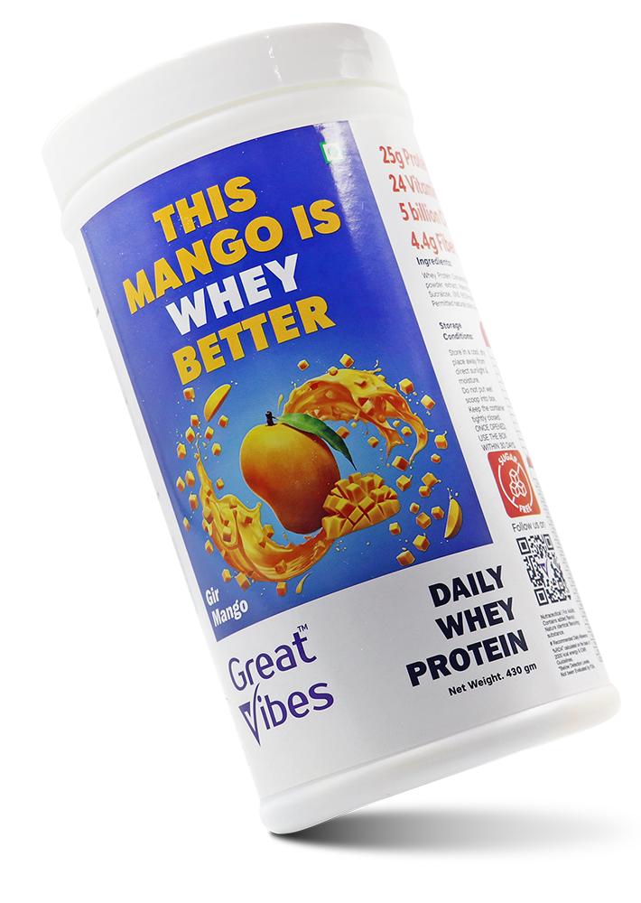 Great Vibes Mango Flavored Whey Protein Powder| 25g Protein, 4.5g BCAA & 5B CFU Probiotics & Digestive Enzymes | Zero Sugar Protein Powder for Men & Women For Muscle Gain, Weight Loss & Gut Health - 430gm